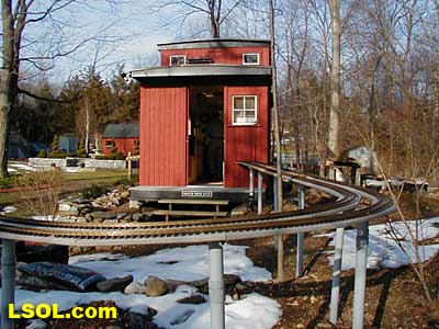 This caused me to prioritize an early goal of providing outside storage to facilitate train operations. As a test for reactions to my idea at a club meeting, I positioned a bobber caboose with a sign reading "similar to be built" at a site behind a stonewall overlooking the layout. Next to that I placed a marker with the words "Mt. St. Ellen (the Mrs.,), future eruptions anticipated". This also acknowledged a need to provide a method of transition into the caboose which would be situated about 36" higher than the layout.
