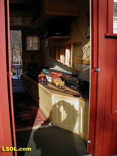Thinking out-of-the-box After struggling with various options to get trains to the caboose and back from the layout without obstructing the entrance, exit or inside aisle, my "DUH" factor kicked in. Trains could enter on one side of the caboose, run along the back wall, exit and turn around outside the caboose, reenter and traverse a double mainline through to the other side and back out to the layout proper.