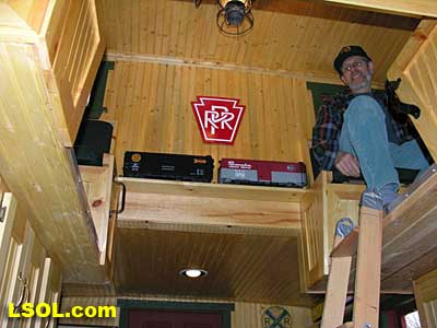 A cabinet below the cupola houses the entertainment center (cable TV also connected to wireless miniature video//sound cameras mounted on locos or rolling stock).