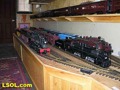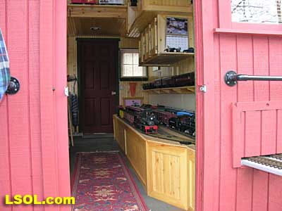 Other interior details (see photos): I made a nice find at the home improvement store with a diamond plate textured 2'x2' foam flooring material with interlocking edges. It cushions the foot and, more importantly, any (cringe!) dropped equipment. I made track-width kerfs on the shelving used to hold my growing inventory of rolling stock/locos (impetus for the expansion plans).