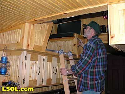 The worktable was raised about 20" from the floor (A higher elevation would have been more desirable but I was constrained by the excessive run needed to maintain a reasonable grade of about 3.5%). Next I put up insulation and applied the drywall. For a finished look, I constructed pine face frames using a pocket hole jig. I routed the inside edges to accept the same beadboard strips I had used as wall and ceiling paneling. I used similar face frames and panel inserts for the cabinet doors.
