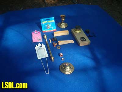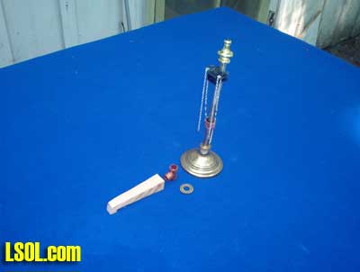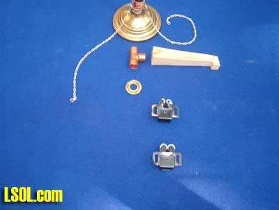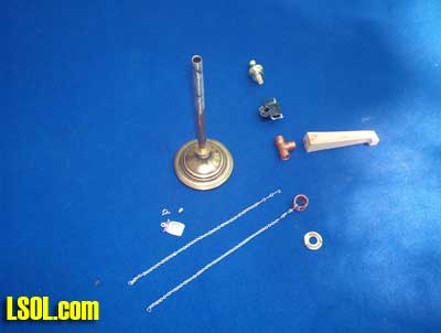 01 - This is an overview of the parts used starting from the left, A child's necklace from a Dollar store/Toy store, cheaply made but having a metal chain, At the top, Going across to the right, A package of Lamp Knobs, of which one will be used at the top of the water column, with a 1/4 inch short wood dowel inserted into its base which will drop into the top of the column, next being an assembled brass candlestick holder (.50 cents) of which the top is unscrewed and a 3/8 inch hole is bored through the existing smaller hole that holds the base and candleholder together. (A base, ready for drilling, is at the bottom of the picture.) If you will zoom in, you will see the brass plated column with a lock nut already in place on it. Coming up from the base, there is, first, the brass nut to hold the entire column upright. Not shown is a round hollow piece of plastic with a 3/8 center hole going through it, that is about a 1/4 inch long (off of a sharpie or large ball point pen), that will cover exposed screw threads between the base and the lock nut that will add that much more to the overall height. Above the brass nut is a 3/8 x 1/2 copper pipe with two 1/16 holes drilled opposite each other at the very top. This is your counterbalance, which will be at the end of your two chains and has the upright column going through it. Next is a 3/8 brass washer which will be located to hold up the 1/4 inch copper "T" by means of a 1/16 hole drilled through the column and having a short piece of wire passed through it at a distance determined by sliding on the brass washer, the copper "T" and the cabinet fastener which will be at the top of the column. The spout is made from soft wood (pine is fine!!!) and cut 3/4 x 3/4 x 3 1/2 inches. (Two examples are shown, one ready to cut out with pencil markings on it, and one cut out.) Above that is the cabinet door fastener (more on how this gets altered and used coming up), and to the right is two of three possible bases, the first being a 3 1/2 x 3/4 x 6 "cement" base with a drain (which is a plasticville window) and also a base made from leftover ceiling lamp fixtures glued together, which if used with the "cement" base would raise the column about 1 1/4 inches as the column would be attached to the brass base, not the cement (wood) block, the second option being just use the glued together base, and a third option, which is what we are following here, is using the brass candlestick base alone. Yet one more option, is to find a 3 1/2 stamped brass plated base that is used as a ceiling fixture, which will appear the same as the brass candlestick holder, but has a 3/8 hole already drilled in it.