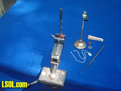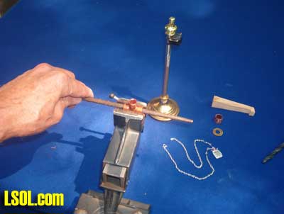 02 - Here the base is pre-assembled, and this step will require patience and an electric drill with a 3/8 inch bit. The copper "T" fitting, which is 1/4 inch copper from a well equipped hardware, must be drilled, slowly, (I recommend quick stops and starts, working from both ends toward the middle.) What we are doing is removing 1/8 from the inside of the 1/4 pipe...this will leave a 1/16 shell, so yes, it will widen out to 3/8 !!!.