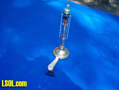 07 - The column assembled except for the spout. Shape the spout down to circular size by sanding and/or filing and in the wide (inlet) end, bore a 3/8 wide hole. I used a large sharp countersink in a drill for this. Doing this with enough depth that will allow the protruding part of the "T" to pass into the spout and be able to pivot up or down. Drill a 1/16 hole close to the end of the spout, horizontally, and do the same for the protruding "T". Insert a piece of 1/32 wire through the spout and the "T" and crimp over the protruding ends. (Go to picture 08 and zoom in on this and it will clarify this step. Picture 08 will also shown a band going around the lower end of the spout, made from aluminum (or annealed copper wire) that has a 1/6 hole drilled though the top of the band as shown, with one large loop left on, open the loop and pass through the hole in the band, and then take the second chain, remove the large loop, and hook the last link of chain directly to the large loop and bend and crimp back together. Add a pull down of some sort...wire/chain, whatever, to the bottom of the band.
