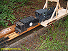Locomotives are taken on and off the carrier directly to the track by means of a loading ramp.  Click for larger picture Loading Ramp The loading ramp is made of 1/4" plywood. The ramp is 18" long x 3 9/l6" wide. Note that it has flange ways that match up with those of the carrier. The ramp is notched to fit down over the rails so that the tapered end drops down between the rails. The underside is slightly grooved to also accommodate the rails. The end that fits against the ramp has a wood block attached. This block is the width of the inside of the rails and thick enough to bring the ramp level with the carrier. Since I use battery power, engines are driven on and off the ramp. I've loaded track-powered engines by sliding the engine up or down the ramp. I'm sure that with a little innovation operators of track powered engines will be able to devise a way to "drive" an engine on and off the carrier.  Click for larger picture Carrier With Loading Ramp In Place Engines are held in place by means of a plywood wheel chock that is kept in position by wooden dowel pins. This chock will not keep an engine from sliding off the carrier if the carrier is allowed to tilt at a steep angle.