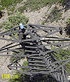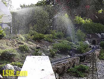 With all this material I figured I would be able to water my yard without waste and I would not have to worry about water where I did not want it. What a surprise I had to look forward to. In order to make the water go where I wanted it I used all of these things and still needed more. My model building wife would not allow the placement of pop-up or spike supported spray heads where they would detract from the trains or buildings, unless they were disguised. I designed a pop-up in a piece of 3/4" PVC with antennae on it (think cellular telephone site) and she said that she was not working hard on buildings just to have them blighted by cell sites so that never got installed. I have placed some pop-ups behind rocks where they can be hidden. Spikes get near plants or other taller items that tend to camouflage them. I also built some of the Aristo Power Tower kits to run power lines on my ridge top. I decided these were the perfect place for spray heads. I ran tubing up one leg, secured by black (UV resistant) zip ties from Panduit. I have three power towers and one tower to be used as a communication site which are rigged with spray heads. These, in conjunction with some pop-ups and spikes, take care of water for most of my burm. The foliage on the burm is blue mound juniper, sedum and thyme of various varieties for ground cover, and rosemary, miniature pomegranates, and Mexican heather as trees.