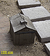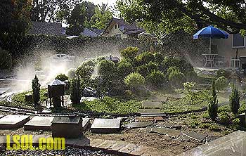 There are two power towers and two pop-ups easily visible in this picture and in the upper right is the communication tower. All are spraying water. The tower in the foreground is not plumbed. The large sheet of plexiglass is the cover for my truss bridge to protect it during persimmon season. It is used about 5 months of the year. Around my Church Hill I have a ring of 1/2" tubing with spray heads installed directly. They are pointed up on about a 60 degree angle to throw the water into the air all around the hill. I hit on this process because, by trial and error. I found that the prevailing breeze always blew the water away from the hill, no matter where I placed the spray heads. In this configuration I get good coverage no matter which way the breeze blows. The Church Hill has sedum and thyme as ground cover and miniature pomegranate,  Church Hill curtain of water Mexican heather, White Swan, rosemary and santolina as trees.