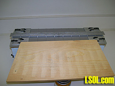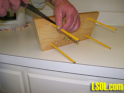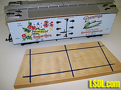 This write-up describes a little project I had in mind for several years, but somehow the right piece of lumber was never on hand. Finally, prompted by the invitation to submit hints for the 2011 LSOL calendar, I decided to go ahead with a less than ideal piece of 1" x 6" that was on hand. I wanted to drill holes in the board so that I could use common wood pencils to hold rolling stock for oiling the axles and changing couplers. My finished maintenance stand works, but could be improved. In this article, I'll tell you what I did right, what I could have done better, and I'll throw in a couple of cautions.  One of the requirements for the stand was that it be able to hold cars without damaging the fragile details that so many of our cars have, such as the ice hatch hinges and latches on my USA Trains woodside reefers. You may notice that in the picture above, clearance for the brake wheel is by letting it hang over the end of the board. In practice, when a detail is easy to remove, I just remove it until the maintenance is completed. The materials are simple: a piece of 1" x 6" lumber of suitable length and a pack of common pencils with erasers. The 1" x 6" I used was salvaged from an old layout, and it was cut on an angle at both ends. Since I saw no reason to square the ends up, I left them as they were. The tools needed are minimal too: a tape or ruler, a combination square, a drill bit that makes holes that will hold the pencils snugly, an electric drill or drill press, a fairly coarse flat file, a pen or pencil, and a hacksaw or hacksaw blade.   When I placed the 1" x 6" next to a reefer, and I saw that I could locate holes 10 inches apart and that would work for all my reefers and boxcars. Then I checked the width of the reefer roof and concluded that the holes should be spaced, widthwise, about 3 1/2" apart. That would put the holes 1 inch from the edges of the board, since what is nominally 1" x 6" lumber is actually 3/4" x 5 1/2". So I drew a line 1 inch from each edge. Then I located and marked the center of the board, lengthwise, and measured 5" toward each end. So basically I marked a 3 1/2" x 10" rectangle on the board, centered end-to-end and side-to-side. The corners of the rectangle were hole locations. The lines have been darkened with a felt-tip pen to make them easier to see in the pictures.   At this point, it looked like the four corner holes would work fine for reefers and for boxcars about the same length as the reefers. But I also have some little starter set 4-wheel coaches, and I want the stand to work with them too. When I put one of them next to the board, I could see that some more holes would be good. I marked off four more holes about an inch from each end and four about two inches from each end.   With these holes marked, I could have checked for other hole locations for other types of rolling stock, but I decided to go ahead and drill some holes and cut some pencils. I found that a 19/64" drill bit made good holes for the pencils I used. The first time I pushed pencils in the holes, they were tighter than I wanted, but pushing them in and out loosened things up a little. It gave a nice snug fit, but the pencils could be pushed in and pulled out fairly easily. I wanted the pencils to not wiggle around, but the ends of the pencils on the workbench would support the load so the pencils didn't have to fit tightly. If the pencils are really tight, a little sanding will make them easier to slide in the holes. I used a metal-cutting bit, and a word of caution is in order. Strange as it may seem, it is very easy to ruin a bit by overheating the cutting edges. A significant amount of heat is generated and wood doesn't carry off heat like metal does. Pause after every two or three holes and let the bit cool. If this had been a "craftsman quality" project I would have clamped a second piece of wood tightly behind the one I was drilling to reduce the splintering where the bit comes out. On this project I wasn't concerned about a little splintering, so I didn't bother. I used a drill press since it was available and made it easy to get the holes square to the board, but that isn't necessary as long as the holes are close to square. Once the holes were drilled it was time to cut some pencils. I pushed four pencils in and placed the stand, upside down, on a reefer. To reduce the chance of breakage, I didn't want the pencils longer than necessary, so I kept checking clearance and pushing them in farther until finally the ferrules were to the wood. There was still clearance between the board and the ice hatch hinges and latches, and the roof walk.  With the hacksaw blade against the board, I cut off the excess length of the pencils. Hacksaws are made for cutting metal, but I find their small teeth make them good for cutting small pieces of wood. WARNING: DO NOT CUT THE PENCILS INDOORS!! When the saw goes through the graphite, it makes a bigger mess than you would want indoors, even in your shop area. Supporting the ends of the pencils when finishing a cut helps reduce splintering. Once the pencils are cut, the stand is ready to accept reefers, boxcars, and coaches.   Moving the pencils toward the center of the board makes the stand convenient for holding the short coaches.  So now I have a stand that can be used with my reefers, boxcars, and short coaches. The next things I looked at were cabooses. I put four new pencils in the board and pushed them in until there was just a little clearance with the highest part of a drover's caboose. Before I cut the pencils, I checked that they would provide clearance with my other cabooses, including the woodside caboose in the picture. The combination square is useful in gettine all the pencils the same length.   Next I cut the excess off these pencils, as I did before with the first four. The stand is ready for cabooses.  With the pencils cut for the cabooses, I put a big streamlined vista dome car on the stand, and that's a fairly 