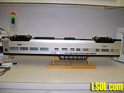 | Thanks for all the nice comments. It you have long cars like the USA aluminum passenger cars, you can take another small piece of wood and drill two holes 3 1/2 inches apart. Let one end of the car be on the original stand and let the other rest on the second block. This would give better support to the car, and the vista dome can be in the gap between the blocks. This would mean that short pencils could be used. This might also work well for cabooses. It would be better for long engines like the PA-1. I haven?t tried this yet, but it seems like it would work. |