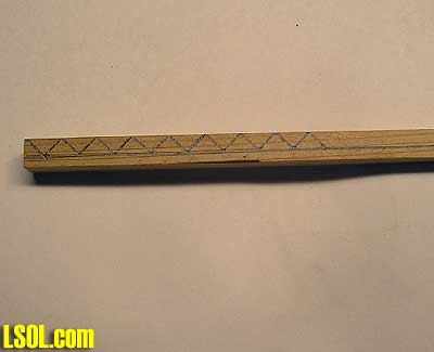I received a couple E-Mails from some of the guys here in LSOL about making stairs. So I thought this would help some of you guys and gals make your projects a bit easier. Lets start by first getting yourself a piece of stock 12 inches long and 1/2 inch square. I used cedar for this article. Cedar would be a good choice because it holds up to the elements pretty well. Draw a line 1/8 above the edge of the wood.