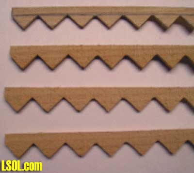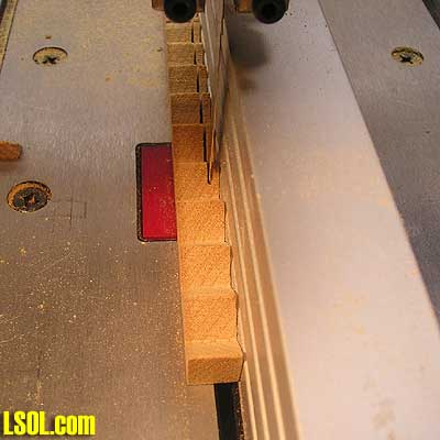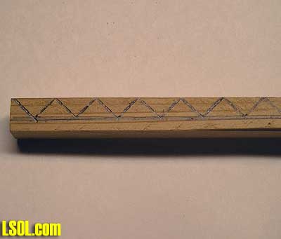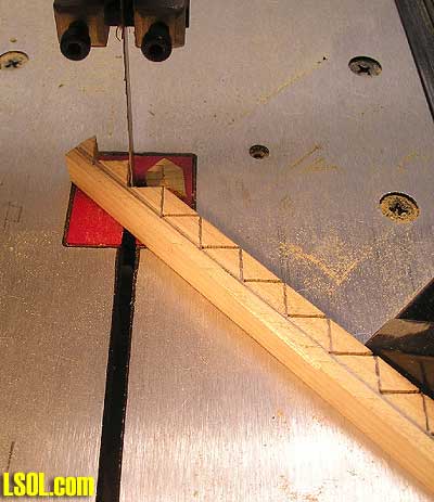 Next after drawing your lines, using a band saw, set your miter gauge to 45 and start from one end and cut the lines you had drawn on the wood.  FULL SIZE STAIR DRAWING Here is a full size drawing in PCX format. Click here and your default graphic program will open and you can print.