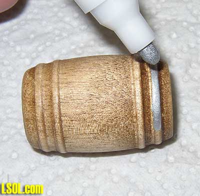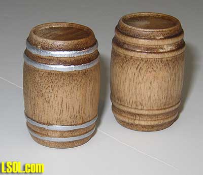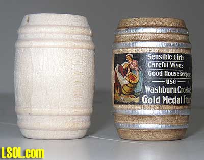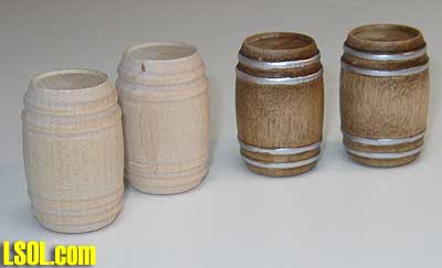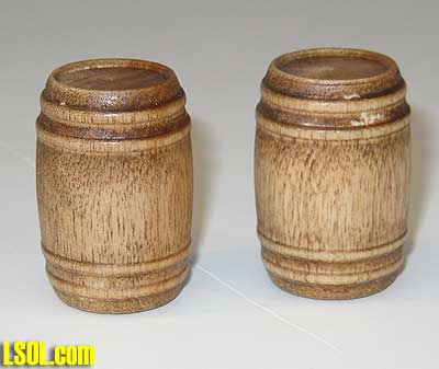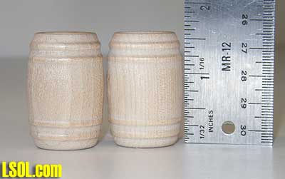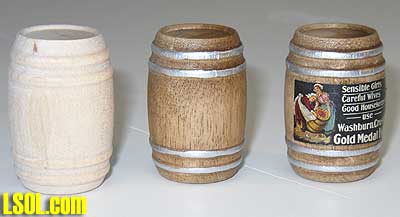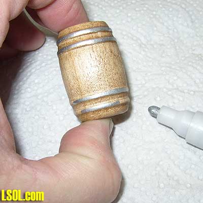 I know I sound like a broken record, but I see more and more items on eBay for inflated prices. It really drives me crazy. Here is the second article on creating some of these accessories for yourself. Last time we learned how to make boxes, this time we can learn how to make some wooden barrels. In the last couple centuries almost everything that was shipped, from apples to oil, was packed in a barrel. They were easy to roll down the gangplanks of ships and roll up the ramps of box cars. They are a perfect addition to most any layout. Let me show you with pictures just how easy it is to do it yourself.  Barrels like this can be found at most craft stores. They are the perfect size. (1 5/8" tall x 1 1/8" diam) Lara's Crafts has them as Pickle Barrels #10034. The cost is $0.79 cents for two unfinished barrels. If you cannot find these at your local craft store you can order from their web site.  Our first step was to stain the barrels. Make sure you clean the barrels with a soft rag so that they are clean of any dust or dirt. I used some old stain that we had in the garage. A little goes a long way. If you are doing a lot of these one fast way would be just to dip the barrels in the can of stain. You could use different color stains to make lighter and darker barrels.  If you look at these wooden barrels you will notice that there are bands at the top and bottom of each. What we want to do is paint these to make them look like there is a metal band holding the barrel together.  We found a great tool for doing this painting. Painters Paint Markers from Hunt Corporation. These are the same people that make Xacto Blades. These are markers that are full of paint. Painters are available in 26 bright colors including 4 metallic. Painters can be used on most surfaces from wood, pottery, photos, plastic, glass, and even foam board. They are Available in Fine, Medium, and a New Calligraphy Point.  All we had to do is use the marker to color the bands with a silver paint. It was a lot easier than trying to use a brush. The more barrels I did the faster I could do them, and the better the barrels looked. As you spin the barrel watch out for the wet paint on the previous bands. If you are doing several barrels it is better to paint one band on each barrel and then work your way back around to the first. The paint drys rather fast. Check out the following pictures to see what the finished barrels look like.   A barrel like this looks great. The price is right as it is less that 40 cents per barrel. But with a label a barrel is even better. So just look around the Internet for barrel labels. We started at www.google.com for a search of Pickle Barrel Labels. We found links with pictures for flour barrels, tobacco barrels and many more.  We printed out some labels and attached them to the barrel using some rubber cement. Some of the images were the right size. Others pictures we had to resize to fit the barrel.  Not a bad looking barrel. If you make some please send me your pictures!  Top of Page