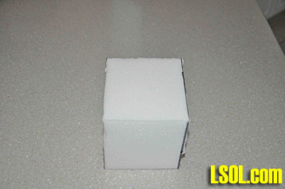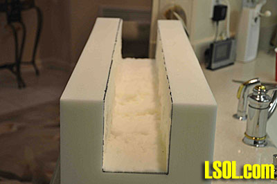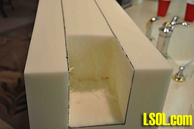 Because the knife blade is about six inches long, I put a mark on the blade at five inches so that I would know how far to cut down into the block. I proceeded to cut the depth cuts along the entire length of the block. Once those two cuts were made I cut across between the two side cuts at about five inches from the end. I then carefully cut across the bottom of the trough and after cutting again in each original cut to loosen the resulting block of foam, I lifted the resulting 5"x 5" x 4 1/2" block of material out. This resulted in very smooth sides, but a slightly uneven bottom of the trough. It is difficult to control the level of the cuts across the bottom of the trough, but I wasn't worried because I had planned to line the trough with material.