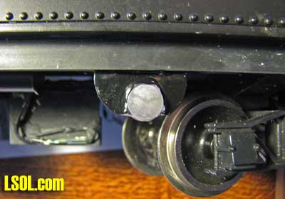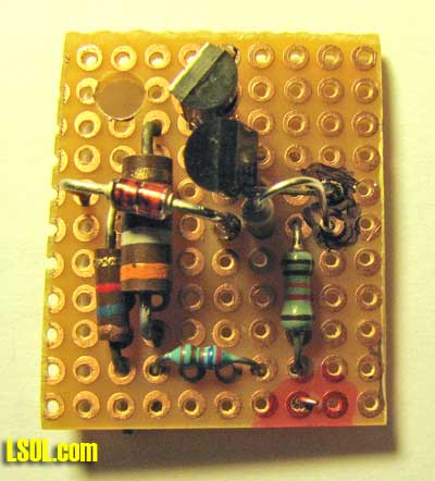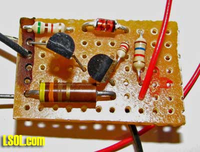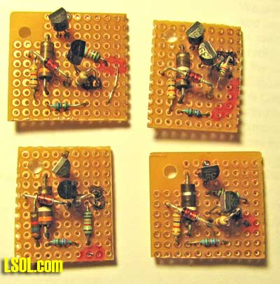 . The resistors can be gotten from Digikey, if you don't find them locally. Semiconductors Q1, Q2: 2N4400/01 - G43375 Z1: 1N4745A - A20411 LED: Bright, flashing - G16424 Construction I built six of these on perforated circuit board. There is nothing critical about component placement. I didn't even try to make them all identical. Here are four of them.  I just located components that connect near each other. I drilled a hole in one corner to mount it. There are four external connections: battery power (2), and the LEDs (2).  Mounting the LEDs and Circuit Board Mount the LEDs to provide good visibility from the normal viewing/operating locations on your railroad. Since my railroad is raised 18-24" in most places, I put them under the tender or battery car. They are pretty unobtrusive here when off, but you may prefer another location.  The reason for having two LEDs is that so one can face out each side of the train and I can see it no matter which direction it is going. I used a .25" x .5" piece of scrap Styrene and ground half a round hole in one side to fit the LED, angling the LED up about 20 degrees for better visibility. The LED is glued to the Styrene with Epoxy and the Styrene is glued to the tender with Styrene cement (use Epoxy if Styrene cement won't melt your car's plastic).  I tried sanding the LED lens on one unit to disperse the light but found that the un-sanded LED was more visible in sunlight. You can find any convenient place to mount the small circuit board. I used a molded-in stand-off on one tender and the speaker mounting boss on another. If need be, drill a hold in the car floor and mount with a self-tapping screw. Be sure to power the battery sensor AFTER the on/off switch on your train so it doesn't draw battery power when the train is turned off. Video of light flashing at YouTube
