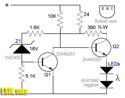 On my battery-powered garden railroad, the batteries always seem to run down at unexpected times, when the train is at the worst possible place - out of sight on the back side of the layout, or in a tunnel, or in the helix. Then I find myself trying to coax the train -- or pull the train by hand --to a location where I can get at it to change the batteries. All the while it's blocking the mainline holding up trains.   I finally decided to do something about this and finding a bright blue flashing LED in a surplus catalog was just the thing to get me started. I wanted the light to start flashing as the battery started to get weak, but while the battery still had a good 10-15 minutes of charge to run the train. That way, if I didn't see it right away, it would still give me time to stop and change the batteries at a convenient location before the train stopped.  I use a pair of 9.6 volt NiCd or NiMH tool batteries. Nominally, a fully charged battery-pair will deliver 19.2 volts. For reasons I won't go into here, I have a diode in series with the batteries driving all my electronics which drops .7 volts. When newly and fully charged, the voltage to my electronics may measure over 20 volts. It quickly drops to around 18.5 volts in use and stays near that level until it nears the end of its charge. At that point it will decline to 14 volts over a half hour or so with the engines I run. I decided to set the threshold at about 16.5 volts. How it Works At first I tried to design a simpler circuit with only one transistor, but that "wasted" too much battery current, so I ended up with a two-transistor circuit. Zener diode Z1 turns on transistor Q1 as long as the battery voltage is above 16.5 volts. Q1 then keeps Q2 and the LEDs off.  As the voltage to my electronics falls to about 16.3 volts, transistor Q1 turns off and Q2 turns on. This lights the two flashing blue LEDs which are mounted under the tender on each side. Once the LEDs come on, the 24 ohm resistor reduces the voltage to the Zener diode by about .25 volts ensuring that the lights will come on strong and not "waffle" about the threshold voltage.  These LEDs have built-in flashers, so they produce a flashing, bright, blue light when turned on. The flashing makes them much more noticeable than ordinary lights. These LEDs operate on 4.5 - 5 volts each at 20-25 ma. The 390 ohm resistor provides the current limiting for the LEDs. Other Battery Voltages The Zener diode is the threshold determining device. A 16V device was right for my battery voltage. Here is a table for some other popular battery voltages. | Battery voltage | Zener voltage | | 12 | 9.5 - 10 | | 14.4 | 12 | | 18.5 | 16 | | 22 | 19.5 | Finding the Parts It should be noted that Zener diodes have a voltage tolerance of 5% or 10%. You really want to get a 5% unit to get a reliable threshold where you expect it. If you get these surplus, they are cheap enough to buy twice as many as you need and select the ones with the closest value to your needs. I got these, the transistors, and the LEDs from Goldmine