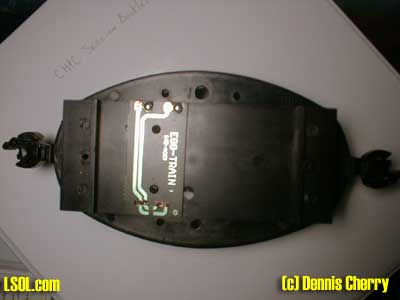 Now what you should have left is just the Eggliner floor assembly with a PC board mounted on the top. Look at the PC board and you will see two copper conductors going between the two connectors. We need to cut these two conductors.