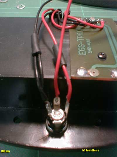After the screws are removed, you need to carefully remove the Eggliner shell. There are two wires from the lamps in the Eggliner shell soldered to a PC board on top of the Eggliner floor. Unsolder these wires; we will put them back at the finish of the conversion. They are not polarity sensitive, which means it does not make any difference what wire goes on what terminal. Set the Eggliner shell aside for now.