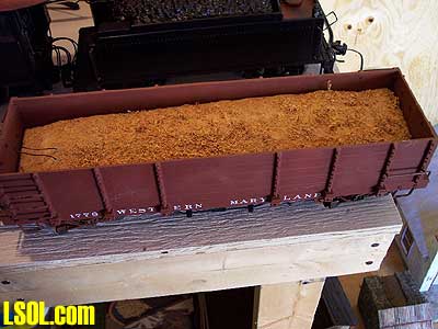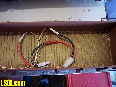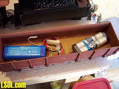 Onboard, Trailing Car or Both? - One of the most challenging aspects of using battery power radio control is trying to figure out where to put the batteries. There are two options for battery placement: Onboard Batteries - If possible, onboard batteries give you the most flexibility in running your trains, and you can run a light engine if you want to. The hard part of course if figuring out where to put the batteries in smaller engines. Most diesels and larger steam engines with tenders are not too difficult to find a place for the batteries, but smaller steamers and engines with no tenders like a Porter or small tenders like a Shay or Climax doesn't have a lot of room and will often require custom packs of loose batteries to fit into the available space. An engine with a tender is usually an easy conversion. In this case I used two R/C battery packs to power and radio controlled a Bachmann 10th anniversary 10-wheeler.   Battery Trailing Cars - The other option for battery placement is to use a battery-trailing car to haul the batteries behind the engine. A power feed wire is run between the car and the engine to transfer electricity to the power unit. If you use lead-acid batteries you will probably have to use a battery-trailing car unless you have a very large engine with a lot of internal space (such as a large cab diesel like the PA-1 or E-8). Aristocraft's newer engines have a power connecting wire built into the engine to make it easy to supply power from their battery-trailing car. I made a battery-trailing car using a Bachmann wood side gondola. I made a foam insert with sawdust glued on top to simulate a loaded car.  I made the car up to carry two R/C battery packs to provide 14.4 volts. While all of my engines have onboard batteries, I wanted to have a backup power supply for my Shay which does not have removable batteries. I wired my Shay with an auxiliary power plug so that when the onboard batteries were discharged I could keep running on auxiliary power.  The car was wired up with female plugs to connect the batteries and connected in series. A small power plug was installed on the car's end sill.  After the batteries are plugged in and laid on the floor of the car, the foam load is placed on top to cover them up and we can run our Shay for another 3-4 hours.
