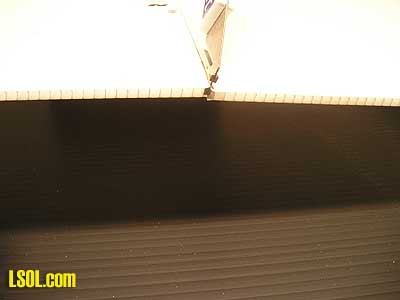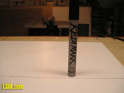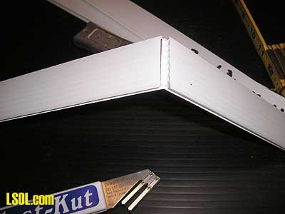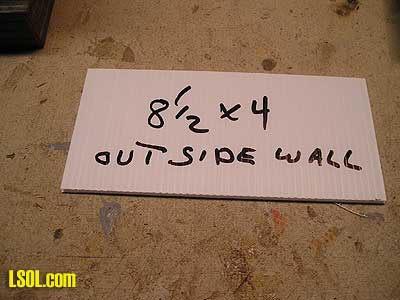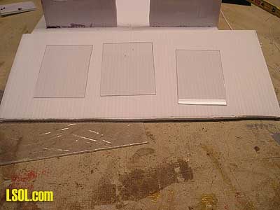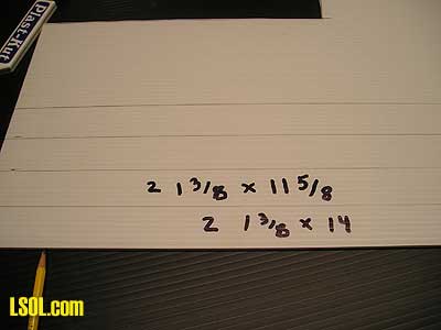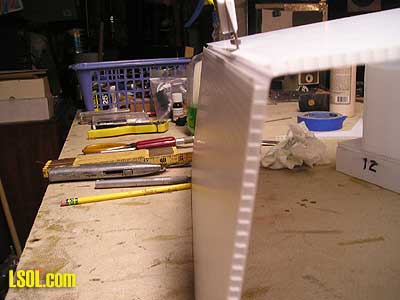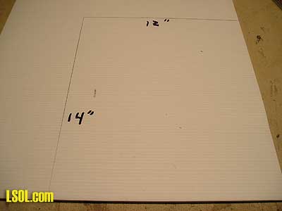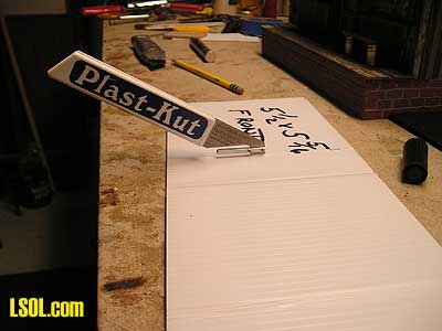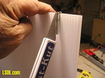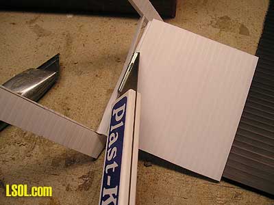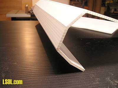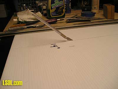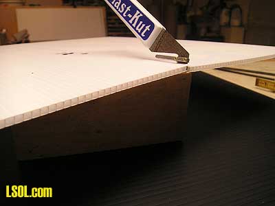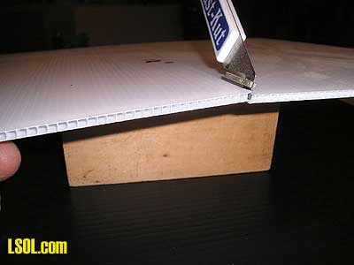 These are the tools I will begin this project with and are commonly found tools in your workshop, except for the PLAST-KUT knife. In the building process I will more than likely be using and gathering more tools. This tool can be purchased in the LSOL by call them toll free at 866.576.5266 if you missed the last article I mentioned it there. This is not a sales pitch nor do I claim to be a salesmen. This was a very handy tool during construction of this building. I will be using either Marine goop or outdoor goop that can be purchased at most hardware centers. In a conversation with supporting LSOL member Elaine Haggenbottom, we discussed the use of goop. Her feelings on the goop was that the odor was to strong for her environment. I agreed that it did have a strange and strong odor. So if you use it, use it in a well ventilated area. Keep in mind that this is my first attempt with this material. I am using this glue because I have had great success with it. I used a black magic marker to mark the sizes of all the pieces for the building.    I will cut my pieces with the Plast-Kut knife for vertical cuts and the utility knife for horizontal cuts. The lines I drew, just drag the PLAST-KUT knife top to bottom vertical with the tube.    I say tube referring to the corrugated part of the CP. Horizontal cuts are made with the utility knife. I cut half way into the board and turn it over and cut the remaining with the PLAST-KUT knife. My next step was to cut pieces for a foundation.  I wanted a foundation to get a step effect in front and to have porch in the front also. The sizes for the foundation are 2 pieces 1 3/8" x 11 5/8". Next was 2 pieces 1 3/8" x 14" inches. Suggestion here, try and layout your building whatever it may be so that your cuts fall in the center of the hollow tubes, makes it much easier that way.  You can see how I cut into the hollow part of the board. Once I made my cut turn the board over and cut the back side and I had my cuts made.    Here I cut the lengths of the foundation across the grain halfway through. I then turned it over and cut the back side, use the PLAST-KUT knife as often as you can it makes the job easier to do. I glued the foundation to the base.