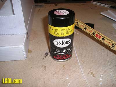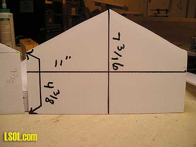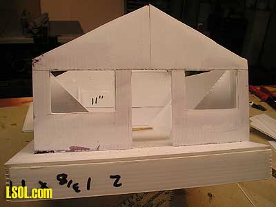 Excuse me this typing is getting my petite little fingers tired, I need to take a break, be right back. I am back and nothing like a fresh cup of coffee.  Okay, I cut the peaks on the 11 "x 7 3/16" pieces front and back walls. Make a center line from the top down. Next make a mark 4 3/8" from the bottom, make this line horizontal across the wall. From the 4 3/8" mark on the edge of the wall make a line up to the center line at the top of the board and it will give you the pitch for the roof. On the front wall mark and cut 2 windows 3" x 2" inches and one door opening 4" x 2". Cut the openings at this point. Once you have your cut outs glue a piece of plastic over the entire cut outs on the inside of the wall.   Once the plastic was installed I sprayed the plastic with Dull-KOTE.