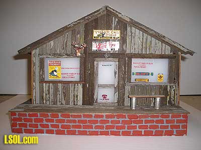 This is a cool way to paint small detail parts. The 2 milk cans will be used as a base for a bench seat. I had to paint the 2 cans so I took some Mini Hold (A wax for holding small parts), put it on the bottom of the cans and stuck it to a scrap piece of plywood and sprayed the cans. Using this method keeps small parts from moving when spray painting. Mini Hold can be purchased at any craft store. These photos show the building complete with some detail parts. Notice the deer head on the front wall. The gas pumps in front are a nice touch.