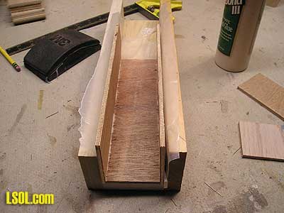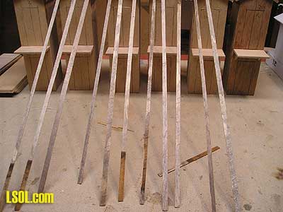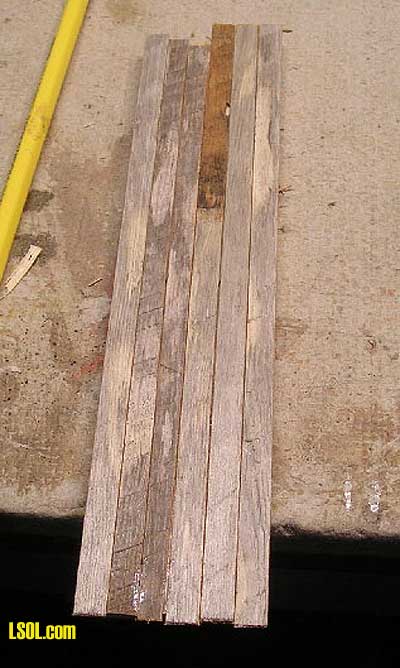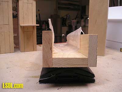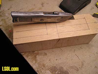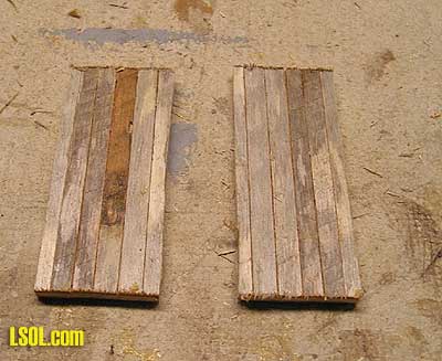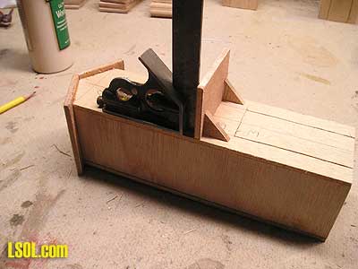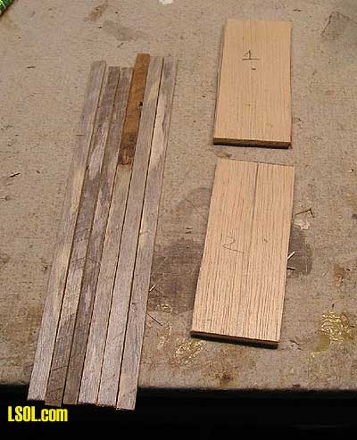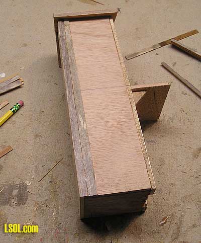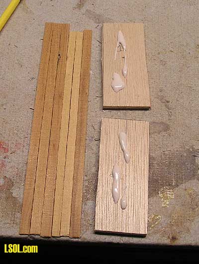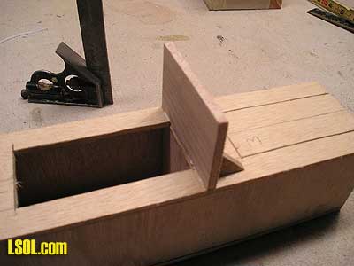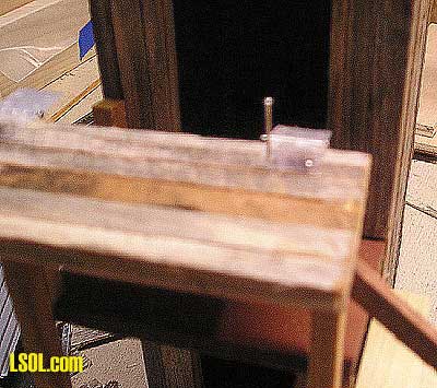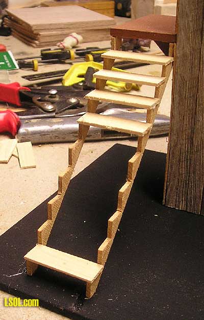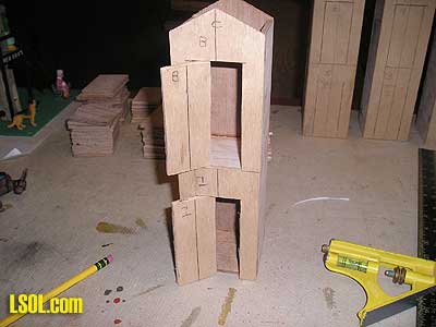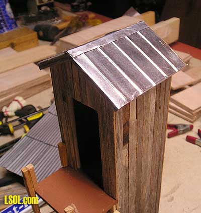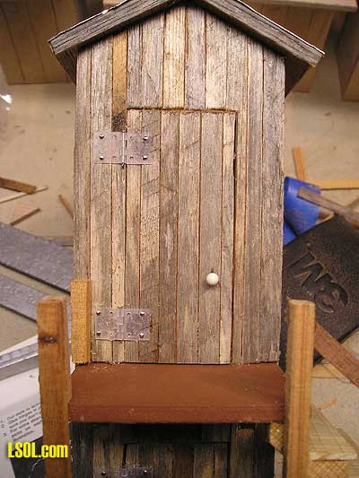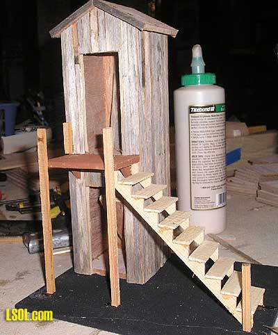Did they stink? They certainly did. Toilet paper was around but most folks saved their money for more useful things. They would use either newspaper or an old catalog like from Sears or some department store. They would wrinkle it to make it soft as possible. In the winter they would use what is called a Chamber pot at night instead of going out in the cold. In the morning they would go and empty it and than go down to the river if there was one close by and wash the pot. Guess they did not care who was swimming down stream. One more thing. Did you ever wonder what the Crescent was for? I was so you knew it was for the ladies. The men's had a star on their door. Let's build a 2 story out house. First I came up with a size, the height is 9 1/2 inches to the peak and it is 2 3/4 inches square. I plan on building a few of them so I made a jig  to make assembling them easier. The inside of the jig measures 2 7/8. I pre cut all the wood before I started. I used 3/16 Luan because I got in the job at no cost. Below is a list of the parts. 2 pc. 2 3/8 x 2 inches Roof 2pc. 9 3/4 x 2 3/4 Front and back walls 2 pc. 9 x 2 3/8 Sidewalls 2 pc. 2 3/8 x 2 3/8 floors 1 pc. 2 3/4 x 1 3/4 Landing 2 pc. 3/4 x 3/4 braces Post 3/16 x 3/16 14 inches Rail 1/8 x 1/4 13 inches Base 1 pc 6x8 inches Seat 1 pc. 2 3/8 x 3/4 inches In the jig I put a side wall 2 3/8 x 9 on the bottom.  You will also notice a piece of waxed paper. It is there so the parts don't stick to the jig.  Here is the front and back walls 9 3/4 x 2 3/4. Measure at the top of the wall down 3/4 inches and draw a line across the wall. At the top of the wall measure in 1 3/8, that is the centerline. Where you drew the line across the wall at each end of the line draw a line to the center mark that you made on top and that will give you the pitch of the roof.  I cut the peaks on my band saw. Hang on for a second I need to get my coffee, it keeps my motor going. Okay I am back. Next I took the four walls with the outside facing down. Draw a line from the bottom of the walls up 4 5/8 inch. Warning this measurement is critical. Be accurate as possible with it. Now I put the 2 3/8 piece in the jig and took the front and back walls and applied the glue on the edge. I then put them in the jig gluing them to the side wall.   OK, once that is done you will notice inside the 4 5/8 inch mark on the 3 walls, I took one of the floors and glued it on 3 sides and set it on the 4 5/8 inch mark. making sure the top of the floor to the bottom of the wall was 4 5/8 inches.   Use a small square installing the floor repeat the same for the bottom floor. The bottom floor bottom should be flush with the bottom of the wall. You will notice in the jig some white wedges they are acting as clamps, that is why the jig was made 1/8 bigger than the outside measurement of the building. I purchased the wedges at a tile distributor.  Next I took the remaining wall and glued it in place and put aside to dry.  Now that the walls are dry, I removed it from the jig. Look at the center line in the photo below. There is a vertical line 4 5/8 from the bottom of the wall and the outline for the doors.   This part is cool; I like the way I made the doors. Draw a centerline 1 3/8 inch from the edge of the wall from top to bottom and 4 5/8 from the bottom of the wall. Mark 3/4 inches on each side of the centerline it will give you the door width 1 1/2 inches. From the bottom of the wall measure up 3 1/2 inches and from the 4 5/8 inch mark measure up 3-1/2 inch for your door height. This is the cool part using a hobby knife or utility knife; I used the latter to cut out the door openings. I did this so I do not need to make doors. The piece you cut out will fit back in there perfect, it has to.  Pretty neat hey, If your 4 5/8 measurement was correct the bottom the door on the second floor would be flush with the floor. The roof parts are 2 x 3 1/8.  Notice that one side of the roof parts are on an angle, I did that on the sander.  Apply glue on the roof pieces that were sanded and glue to the walls that have the peak.  Take a look at the landing and the 2 braces that will hold the landing to the building. Glue the braces to the landing.  Once that is dry glue the braces and landing to the building so the landing is flush with the floor inside the building.   The door should be flush with the floor. Lets take a break I need to go to the hobby shop and get some hinges, if any one shows up tell them I will be right back. That was fast, got the hinges but before we get to the hinges let's cover the walls. On the building I will be using cypress wood, it was a fence all weathered and beat up and the good thing is the slats are 3/8 thick. I cut them to 3/8, I was than able to cut both sides 1/16 and have the strips weathered and ready for gluing.  The first thing I did was get the 2 doors and stack them on top of each other along with the strip wood.  Make sure the wood is right side up so it will go back into their openings. Number the doors 1 and 2 at the top and back of the door.  Leave a space between the doors as show below.  Put the strip wood the entire length of both doors than put aside to dry.  Not getting into detail, but I put the strip wood on the 4 sides of the building.   Before I put the strip wood in front I painted the landing.  Okay let's get back to the doors.  What I did next was to cut between the spaces on the band saw  In  Here are the 2 doors trimmed on all 4 sides using the band saw. Well I did it I made a big, big mistake. I skipped installing the doors because I stopped for dinner when I got back I forgot all about the doors. Well I am being honest here. I will get to it. After we do the stairs.  Next we can glue the building to the base. Once that dries you can install the stairs   The drawings have a full-scale stringer and step for making a template to create your stairs.  Here are the 4 posts for the rails, notice the small one on the building left of the door, didn't