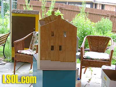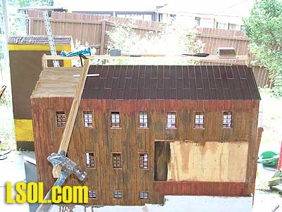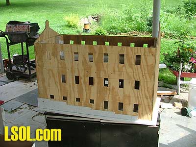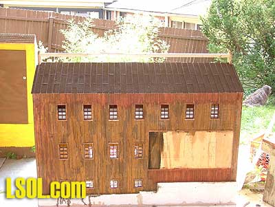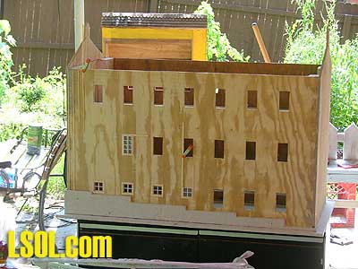 This gave me an idea as to how big I can make the mill. I decided on 3 feet by 2 feet and 3 stories high. I made each story 7 inches; this would give me the high 13-foot ceilings that were common in some older structures. With the basic design sketched out I went and got the supplies I needed. I got a sheet of 3/8-inch plywood (exterior grade of course), a roll of aluminum roof flashing, 2 sheets of Hardiboard (3/8 inch and 1/4 inch thick), a strip of aluminum soffit vent and an "egg crate" fluorescent light diffuser. When I go shopping my list sounds like I am on a scavenger hunt, but that's what I needed. I started by drawing out my plan on the plywood, I tried several different angles for the pitch of the roof, and when I hit on one I liked I went with it. I then cut out the plywood. I also cut out the window openings, some by hand because my little scroll saw couldn't reach all of the openings.
