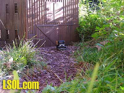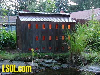 Instant dirt road to the mill, and I know exactly where the wires are buried. To light the mill I took a garage sale string of Christmas lights, cut out a string of 8 of them, and hung them in the mill. The bulbs are 3-volt bulbs, but with 8 of them across a 12-volt supply they get about 1-1/2 volts. This gives them a warm glow, I like that, and means that they should last nearly forever. I have the timer on my lighting power supply so the lights come on a little before dusk, and go off at midnight. So even when I am not running the trains, it still lights up, and the light reflecting off the pond at night really looks nice.