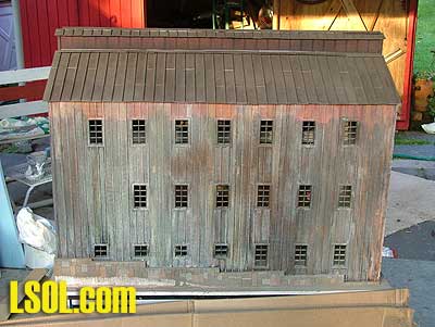 I didn't put any stacks on my mill; I will be building a separate boiler house out of Hardiboard later. I also will be adding a loading dock to one side, that is why in some pictures you see a blank area on one side. I also will be adding the slide that they pull the logs out of the pond with. I also didn't put any signage on my mill because I run different logging trains, plus my Pittsburgh and Castle Shannon Rail Road trains so I need a generic mill, not one specific to one road or another. Now I cleared the lot for the mill and leveled the area. Then I dug a small trench to where the hole in the foundation would end up. I put down a layer of sand, and placed the mill where it belongs, darn its heavy! Then I had an idea, so I put my low voltage lighting power supply INSIDE the mill, and ran the end of the wires I buried for lighting into the mill. I had to dig up the wires, and then bury the wires and the power cord, so when I filled in the new trench I used the broken reddish rock I had.