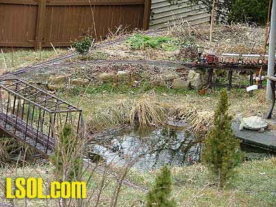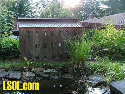 The mill is a big structure, and it looks at home by the pond. But unfortunately it hasn't stopped all the foot traffic across the tracks; my dog still crosses there. And the neighbor kid now walks on the tracks to cross there, instead of stepping over the tracks. Top of Page