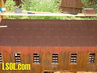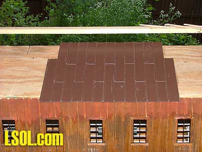 For the roof vent I cut a length of the soffit vent, trimmed the edged so it wasn't too wide, painted it with Krylon ruddy brown (my favorite color for rust) and ultra flat black. I screwed it to the top support with little wood screws from my junk box. I covered the ends with strips of my 1/4 wide wood left over from the window frames. I made flashing to go under the roof vent, and over the main roof from scrap pieces of the trim coil, and sealed the gap with pieces of foam insulation. I sealed the openings so the wasps don't have a new home inside my mill, them pesky little things will nest anywhere given half a chance. The roof vent roof was made the same as the main roof, but with 3-inch long panels. To support the peak I ripped a piece of wood, angled at the top. I would tell you what all the angles are, but I didn't actually measure them with a protractor. I just made it to the angle I cut before, and that was something I just fudged till I got something I liked. Then I capped the roof peak with strips of that trim coil bent to an inverted v shape. On the last panel, the strip is right on the panel, on the rest of the peak its raised above the ribs, and attached with the strip foam insulation I used to seal the gaps on the main roof's flashing.