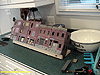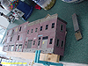 This frame was made by cutting three 1" X 4" pieces of pine to the correct length. The back piece was eventually screwed to the edge of the table with drywall screws, which were also used to fasten the three pieces of pine together to form the frame. From this same photo you can see that I made the sidewalls from 1/4" birch plywood with the Plastruct plastic brick wall material (1/24, PS90) that I had used for the roundhouse (See previous LSOL article on my roundhouse). I cut all of the plywood and plastic brick to match the height of the buildings and glued the brick to the plywood using clear Acrylic adhesive caulk (White Lightning 3006). Again, I used the acrylic light gray paint to fill the mortar lines and dull the brick. I put a couple of windows in two of the end pieces and then glued the ends to the building fronts and frame.