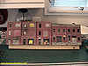 I then glued plastic strips along the ends of the building fronts to make the buildings into two sets of buildings. The strips were painted flat black on one side to make the connection invisible and to cover the slight gap between the buildings. The strips also held the buildings together, creating a set of three buildings for one block and five buildings for the second block. I constructed a frame to hold the buildings to the train table and for depth to allow the buildings to set in about 3 inches from the edge of the table.