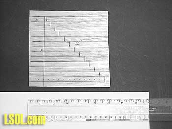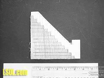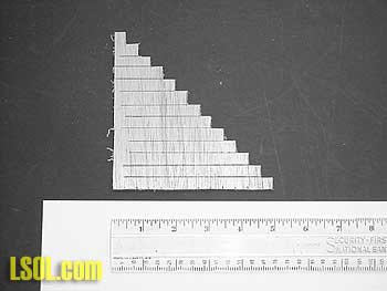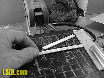 Step 4. Steps are made from Popsicle sticks (Smart & Final sells a box of 1,000 for under $5). The width is just the perfect size. You can make your steps as narrow or as wide as you want them. Using a scroll or band saw, square off one end, and then using a guide for the size you want, square off the other end. There are 13 steps depicted in these photos, so 26 sticks were required to complete the job.