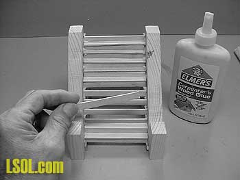 Step 5. Put a drop of wood glue on the bottom side of each stick. Place sticks onto the upright sides of the guides first. After all 13 were glued into place, then glue the sticks onto the bottom of each step. You will find that each step overlaps the upright stick by a fraction of an inch giving the appearance of rear steps. Let the stairs dry thoroughly before going to the last step.