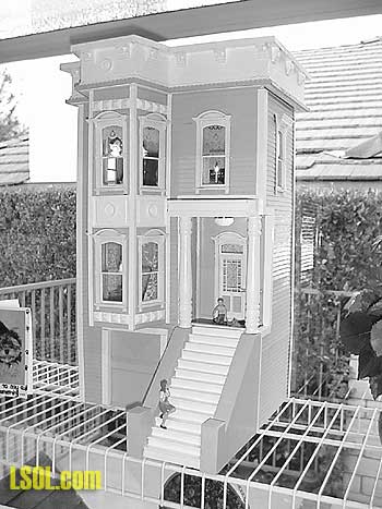 Step 6. Using water-based Latex, brush a base coat of white or the main color of your structure, on the entire staircase and railings and underside of the staircase. The paint will fill in gaps. In my finished model, I painted the stairs gloss white to match the trim, and the railings semi-gloss gray to match the overall structure. Columns were added to tie-in the stairs to the porch area of this Victorian house. The effect is very realistic and costs almost nothing to build.
