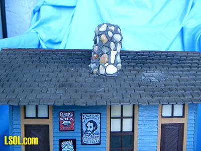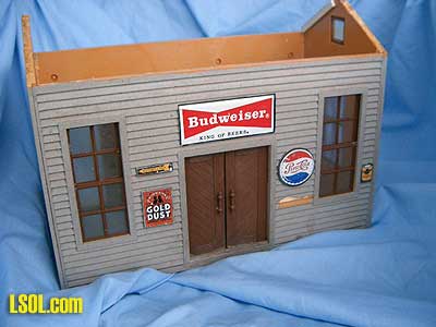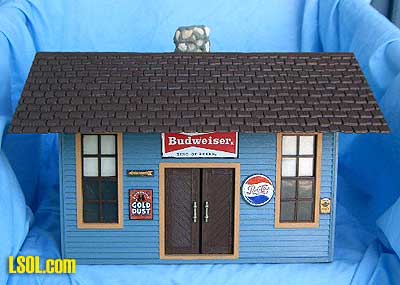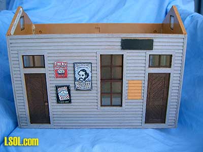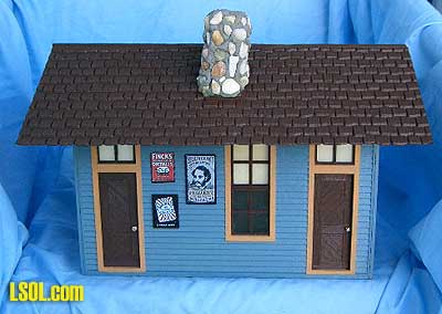 (Front, natural state)  Originally made as a kit by Model Power in Germany a bunch of years ago. After several ownership's, it became a warehouse OR a freight station.. First order of business was to completely wash it, inside and out, with warm water and dish detergent. (Need I suggest you do this in a safe place, as small things have a tendency to fall off in this process.) As soon as it was dry, I started with checking all of the openings, repairing if necessary, and then painting doors, and window trim, if desired.  Note that I use satin or gloss paint for all of my improvements (Bob and some other people can do the weathering. My thinking is: the outdoor elements will weather everything soon enough, so I start out with "gloss") The paints either come in small bottles from Wal-Mart, called "outdoor gloss", or from the "oops" 5-gallon exterior house paint from your local Home Depot. I have a large supply to pick from, as I pick colors I like whenever I happen to be there. Upon deciding on the colors, I began painting the siding. Since many of the signs were still attached, I merely went around them, but removed any that I could. As soon as the siding was completed, usually it takes two applications, depending on the color used and the color you are covering, I did the trim around all windows and doorways. Next, I added some "new" touches to any of the signage, with a small tipped permanent Sharpie marker... Last thing I do is "decorate" the windows by either painting the top portions of the glass, like the transoms, OR adding cloth or paper shades. Most times I use yellow paint to create the illusion of a "warm glow" within. Next the "roof."  This was the biggest challenge, as it did not even come together at the peak. I turned this job over to my husband, Warren. After a lot of "heat and persuasion with a small torch, he managed to pull it together. A scrap strip of wood across the entire top was added to keep it aligned and then all was glued together with Marine Goop. Over the years, this building had lost it's chimney so a new one was created from a small block of scrap pine, angle-cut to fit the roof line's indenture, made by the manufacturer. I again used "Gatorman's" technique for adding small river rock to the sides, mixing a thick paste of ceramic tile "thinset" with a small percentage of Acryllic mortar Admix.  The last pictures show the completed building. Rejuvenated and ready to live again on another railroad.  (Front)  (Back) This endeavor is so much fun for me and I have LOTS more buildings waiting in the wings. Future articles from Elaine???