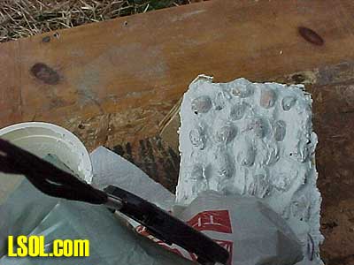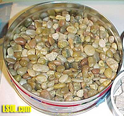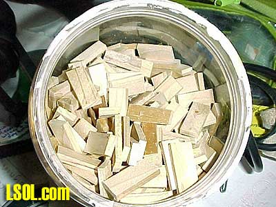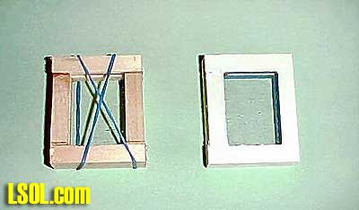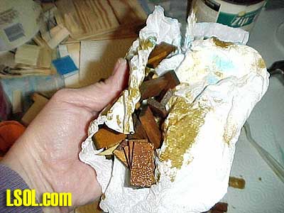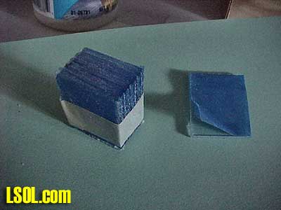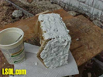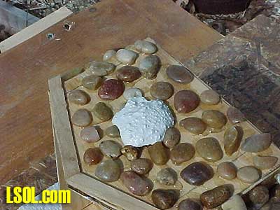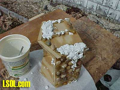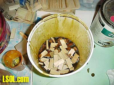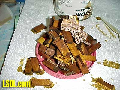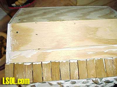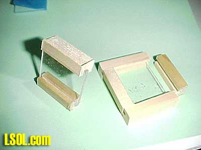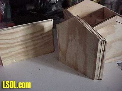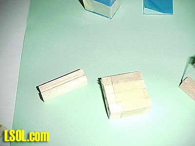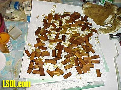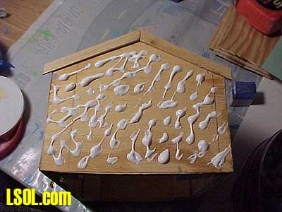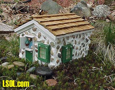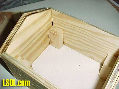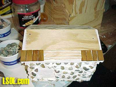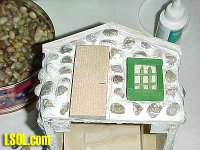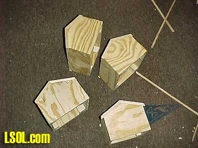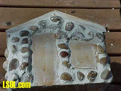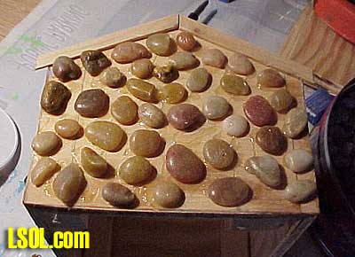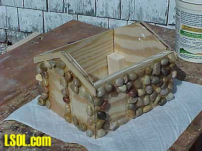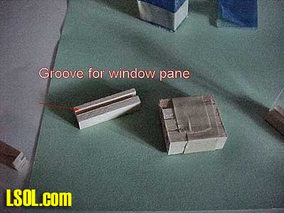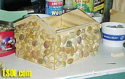 Small stone building Here is a fairly easy project showing how to build a stone building. Once you know how, you can make bigger buildings. It is made from 3/8" plywood. Mitered 45 degree corners. Beveled top edge of sides are 22 1/2 degrees and the gable sides are also 22 1/2 degrees. Start by cutting the plywood. The size is of you own choosing. I like to use the 22 1/2 degree beveled edges, but you can decide yourself. Just build it as you would build a small wooden box. Here are the pieces laid out. Little blocks are glued to the inside corners for added strength. It is easy to cut out and assemble a few of these little houses at one time. I used Loctite's Wood Worx glue and Borden's Ultimate polyurethane glue. I like the fast setting Wood Worx but the outdoor holding power of the polyurethane glue is unbeatable. It takes a long time to cure though. I am impatient. So, what I do is put a little Wood Worx glue on the parts to be joined, then without getting any on the glue bottle tip, I put a little of the poly glue on too. When they meet up you get a little moisture for the poly glue from the Wood Worx. The Wood Worx sets up fast enough so you can move the project out of the way or get ahead on the next step of your project. One thing though, the poly expands and can push things out of whack. Keep the clamps, rubber bands, masking tape on for 24 hours if you can. The Wood Worx alone may be fine but I know I can count on the polyurethane to hold even through the winter. I put my trim on the gabled ends of the building before I do the stone work. The corners don't need trim. Once you have your box house finished minus the roof, you will need windows and doors. I have made dozens of windows. They look plain at first but easy to make and they can be dressed up later. For the next step you will need some 1x1 pine. To save time, plane the pine down to slightly more than 1/2" thick. But read on, there are options ahead. First of all run the 2 edges of 1x1 pine on hand through the joiner for nice clean edges. Small knots are ok you can cut the window pieces around them, but the strips might break in later stages of the window project. Make a groove in the edge with the table saw. I keep the blade about 1/4 inch in from the edge, about 1/8th inch deep. I make a groove wide enough to accommodate the plexiglass, or clear acrylic sheet. The glass should not be too tight, it should slide in. The acrylic sheets are available 18" x 24". More on this later. Repeat the groove moving the rip fence to get the width you need. If you want to make a few of these windows, you can rip through a wider board and make more edges to work on at one time. All the parts will be the same and your windows will match if you do these steps all at once. Also the glass you put in later will fit exactly in all of them. Once the grooves are made, set the rip fence so that you can take a slice off the grooved edges. You will want the strips to be about 3/8" thick. When you have all of the strips cut, you can decide how thick or thin the finished windows will be. If you cut holes to put the windows into you can leave the 3/4" width of the original pine board. Other wise you can slice off another 1/4" leaving all the strips about a half inch thick and you will have some scrap pieces to use as trim somewhere. Stack 4 strips together and tape them together. Be generous with the tape, you will find it easier in the long run. A band of tape around them about every 1 1/2" will keep each cut stack together. Using the band saw, cut half of your strip stacks into 1 1/2" lengths, the other half into 1 1/4" lengths. Take your time and use a square often. The straighter and squarer these are cut the better. You can finagle them later but it is a real pain. I lay them on their side so they are lined up rather than stacked up when I saw through them. I find they come out more square that way. With your wood strips cut, leave the tape on for now. You might want to keep each size in a little box so you don't have to sort them later. Ok now for the "glass". When you buy the acrylic sheets, they have a protective plastic cover on them. Don't peel it off yet. I don't think you are supposed to do this but I cut my strips on the table saw. Whatever way you decide to make your strips of acrylic go ahead. But first! Taking two of each size of the strips, make a window. Lay out the pieces. The shorter ones are the sides, the longer are the top and bottom. Cut a piece of paper 1 1/4" by 1 1/2". Check the fit in the grooves in the assembly. Trim the paper until it fits without curling and has a little room to give. This will be the size of your glass. I have to make a pattern for each set of windows because it never fails. No matter how careful, that table saw blade is a tad higher or lower every time when I make the grooves. Now that you have the dimensions cut a few strips of plastic. If you are planning to do a few of these windows stack the strips and tape them together. I take the stack to the band saw. Cut them just as with the wooden parts. I use the square often even though I have a rip fence. Keep these stacked together for the time being. Don't peel that plastic off yet. No peeking! It will be nice and clear! You will need your wood parts and your acrylic glass and some rubber bands. Use the wood glue of your choice. I have used both the Wood worx and the polyurethane glue. I think the poly was messy and not necessary for this part of the project. I believe it was overkill and the mess.....oh boy. Peel your tape off the wooden parts. Now you can peel the protective plastic off the plastic. I keep the tape on until I am ready to use them because they are in matched sets of 2 pairs. If there is a little variation in the length from cut stack to cut stack and you take them all apart ahead of time it is a real nuisance. This way you have them matched. Take 2 of each size and put glue on the ends of the short ones and the grooved sides at each 