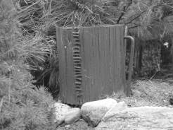 Materials you will need to make your own storage tank: 1 or 2 pound coffee can (turn it upside down); outdoor caulking; wooden coffee stir sticks; brown, gray or black spray paint. You may stagger the ends of the sticks depending on their length. Once you have gone all the way around the can, then do the roof in the same manner. Lastly, spray the can brown, gray or black and you will have a realistic looking storage tank. For even more realism, drill a hole in the side or top of the can and insert a small diameter aluminum pipe and bend it, or fashion an elbow or joint, so it goes down the side of the tank. Or, add a ladder made with pieces from stir sticks split in half. Your finished project will look like the real thing. I added a ladder (stir sticks split down the middle and glued to the side) and a pipe (piece of plastic from a coat hanger) to finish off my storage tank. I then placed in a setting atop a mountain, among trees and rocks and it looks like the real thing. My second try at building a tank took a little more time and effort but the finished product made it really worthwhile. I first needed a model to work from (keep the creative juices flowing). I drove around and spotted one along a BNSF right-of-way and took a photograph of it. Next, I started acquiring materials. I made a base from a piece of 1/8" plywood, cut 12x12 inches and painted it gray to resemble concrete.