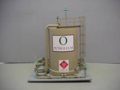 My completed model. The 1/8? plywood was painted gray to resemble concrete. The plastic cookie container was turned upside down and glued to the base. The tank and pipes were painted brown. Then logos were designed on my computer and printed on label paper. A clock face from clip art became the meter face on gauges (glued to rubber washers). Other materials included Quick Grab glue, wheat lamps for lighting, a ladder, lengths of black rubber drip hose, and leftover parts from other models. Fuel gauges were clock faces from clip art printed on label paper along with logos for "Packer Fuels" and green "O Petroleum." Striving for realism, using some pretty simple techniques, can make for some pretty impressive tanks. Top of Page