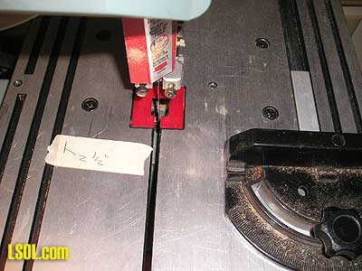 My next step was to cut the 3/8/x3/8 stock into 2 1/2 inch pieces. You can set a gage on the band saw but in this project I put a piece of tape on the table and made a mark 2 1/2 inches and used the miter gauge. To be honest I was too lazy to set up a gauge.