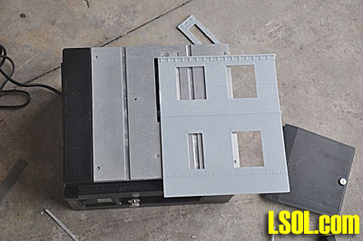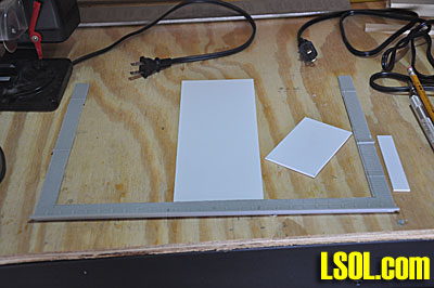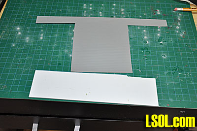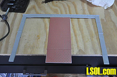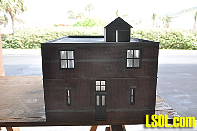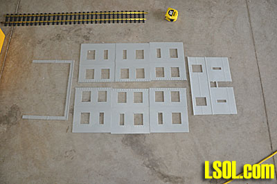 I cut the sidewalls of the kit in half by cutting along the door openings in the first floor. I used my miniature table saw to do the cutting. This gave me the basic wall structure component and I used three of these components to glue together for the long side of the building that fit the measurements I had drawn on the floor.