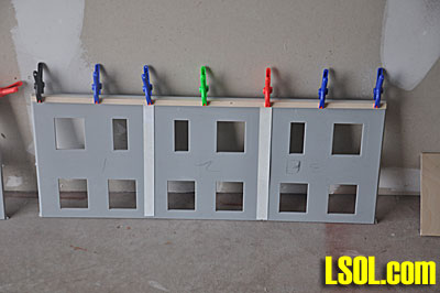 To begin assembly of the walls, I cut additional strips of 3/8-inch basswood for the corner braces, painted them grey on two sides and glued them in place on the ends of the sidewalls. I clamped them to the sidewalls and put them aside to dry.