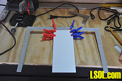 To begin the design, I checked the measurements for the GP-7s and S-4s that my friend, Dave Zinsner had for his railroad. Since my railroads are completely filled with buildings, I decided to donate the building to Dave. He is just getting started in Large Scale and doesn't have many buildings. So after determining the dimensions for the two locomotives, I drew out the building footprint on the floor of my garage/workshop. If you look carefully, you will see the pencil lines for the outside dimensions and the door openings faintly drawn on the floor.