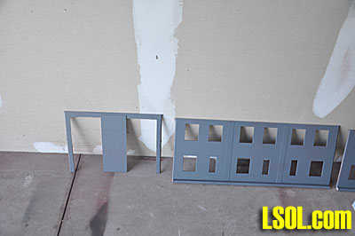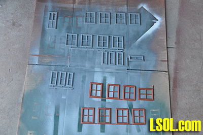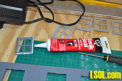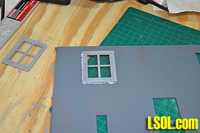 There were a large number of windows in the structure and it took a while to cut out each of the windows, spray paint them grey and cut and place the clear styrene window "glass" in place. I used Plastruct clear styrene for the glass and cut it to fit using a square, ruler and a hobby knife with a new blade. I took a lot of care in cutting the windows from the sprue to be sure that the windows fit correctly into the openings in the walls.