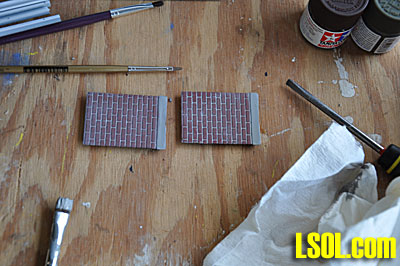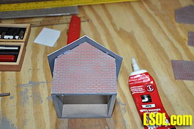 I used my electric sander to smooth the inside of the front wall opening and then cut a piece of styrene to about the same thickness as the walls to fill in the door opening. After gluing it in place using a short piece of styrene for reinforcement, I painted the inside of this wall with the red primer. For the outside I used a piece of Plastruct 1/24 brick material and glued it in place over the styrene piece. It matched the brick on the Colorado Model Structures wall very well.