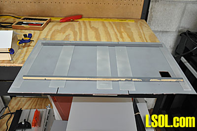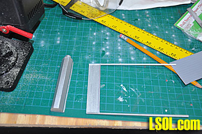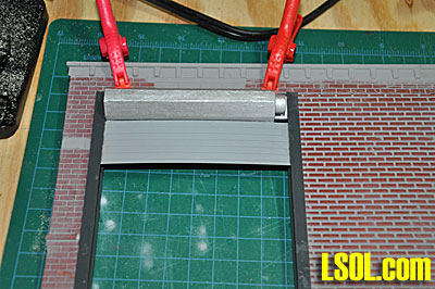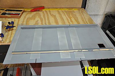 I began the door assembly by reinforcing the openings in the wall with Plastruct girders positioned along the door openings on both sides. These were cut to size on my miniature chop saw and glued in place with the silicon caulk.