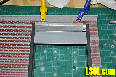 I cut small pieces of styrene to fit across the top of the door openings and glued them in place to give me something to glue the doors to. At this point I realized that the doors were much too short to work without modification. So I cut the drive mechanism off of the top of the roller doors, cut to size some grooved styrene siding material that looked like the metal roller doors and glued all of this in place in the door openings.