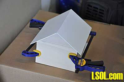 I began to assemble the building by gluing the end walls to the sidewalls using the end corner braces for the glue. Because I didn't have my long clamps with me in Florida, I used some of my power tool cases to brace the building against one of the sidewalls of my workshop. I used a large square to make sure that the building was square before I put the tools in place to hold the building while it dried. I placed the complete roof assembly in place on top of the building and glued it in place.