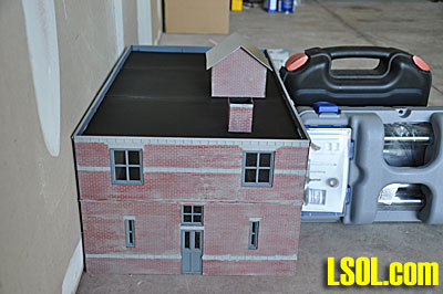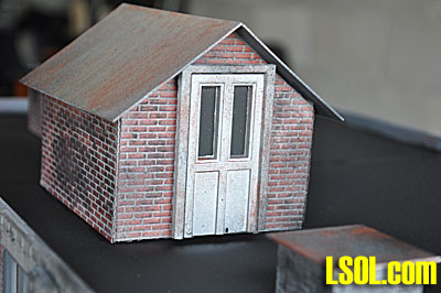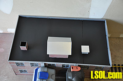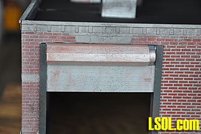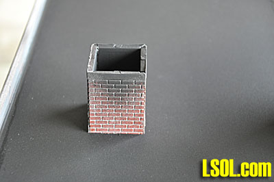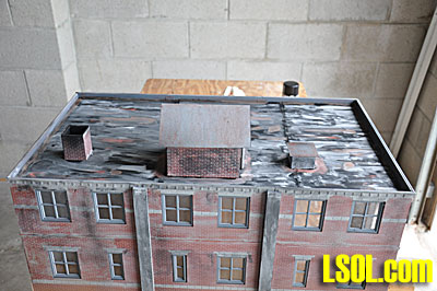 I needed an equipment shed and a roof vent for the roof of the building, so I cut pieces of heavy styrene to the shape of a shed and the roof for the shed and glued it together using C.A. The roof vent was constructed using one of the chimneys that came with the kit. I cut some of the Plastruct brick material and covered the sides of the shed. I cut a piece of styrene to the cover on the vent. I painted the grey paint on the building sides and rubbed it off for the mortar effect. I painted the vent and cover silver. I also painted the roof of the shed with silver. I glued the shed to the roof and inserted the vent into the last chimney hole on the roof.